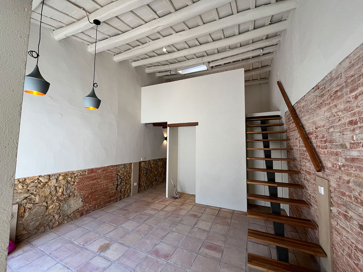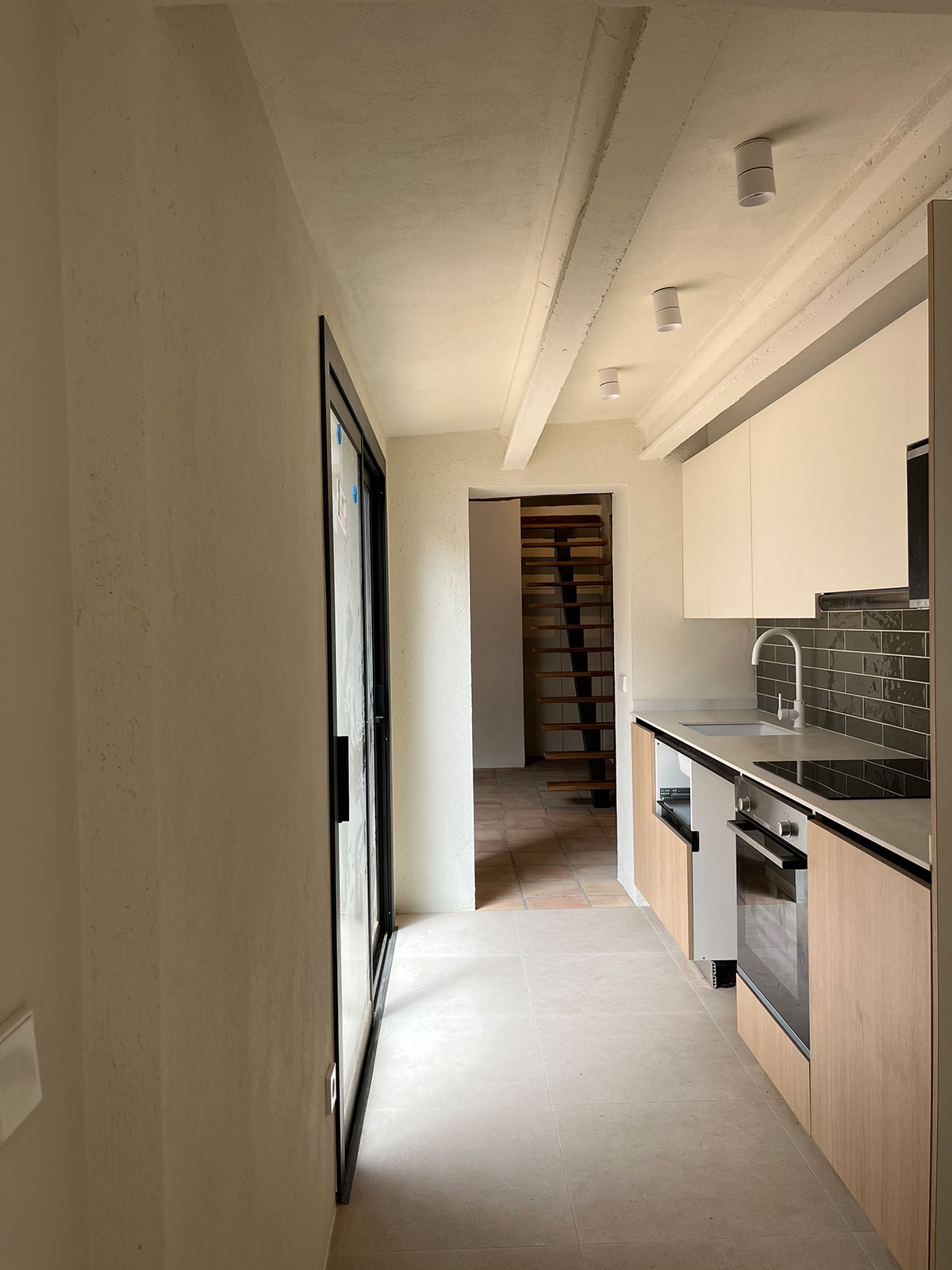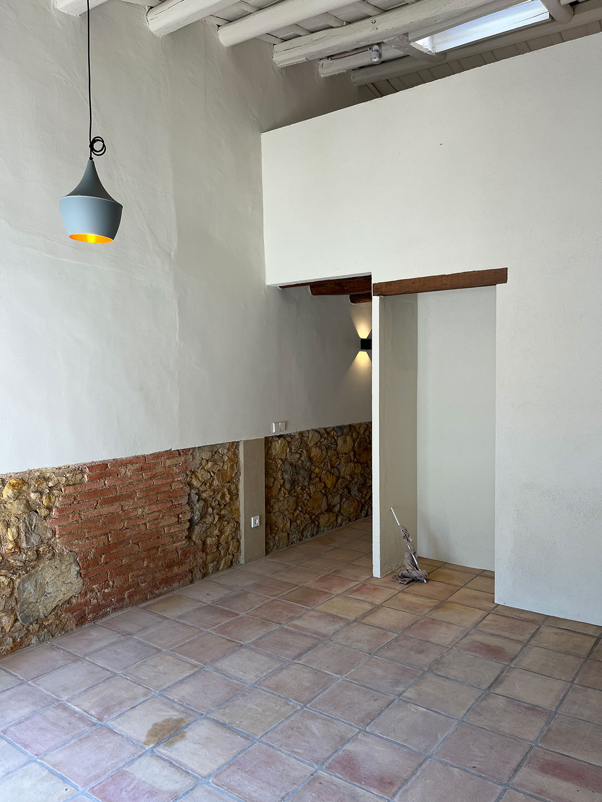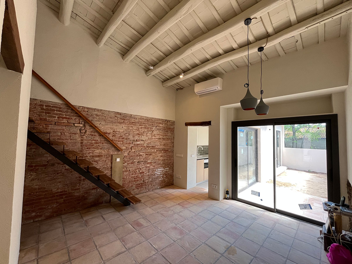 Des de la sala accedim amb una escala metàl·lica a la zona de l’altell i en un laterla de la sala a la cuina. També dona accés amb una gran balconera el pati amb orientació sur de la casa.