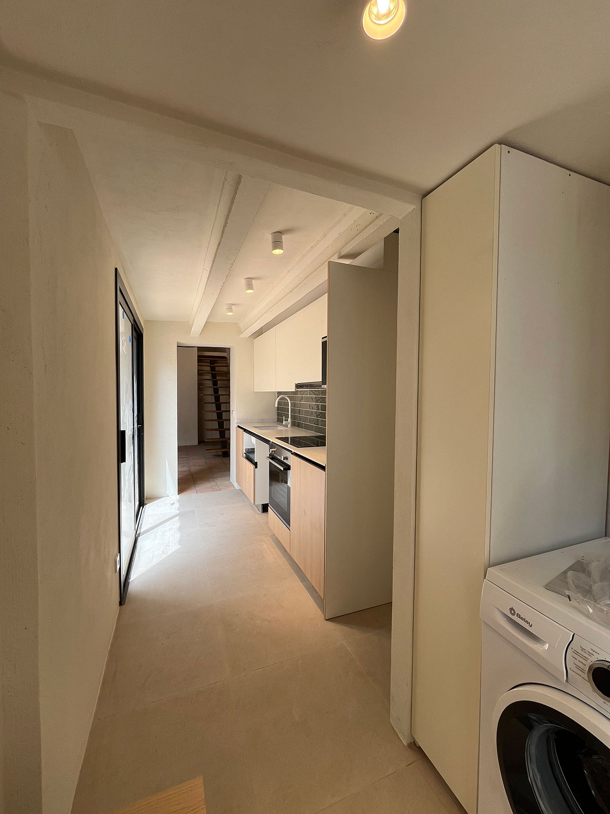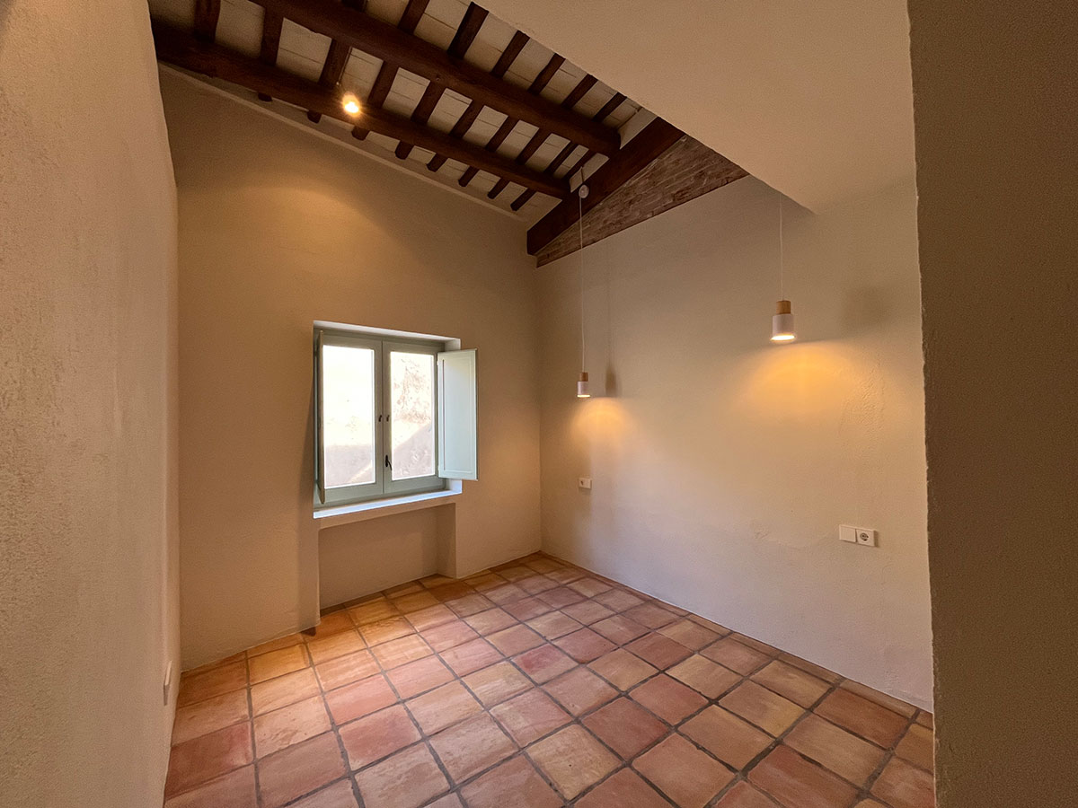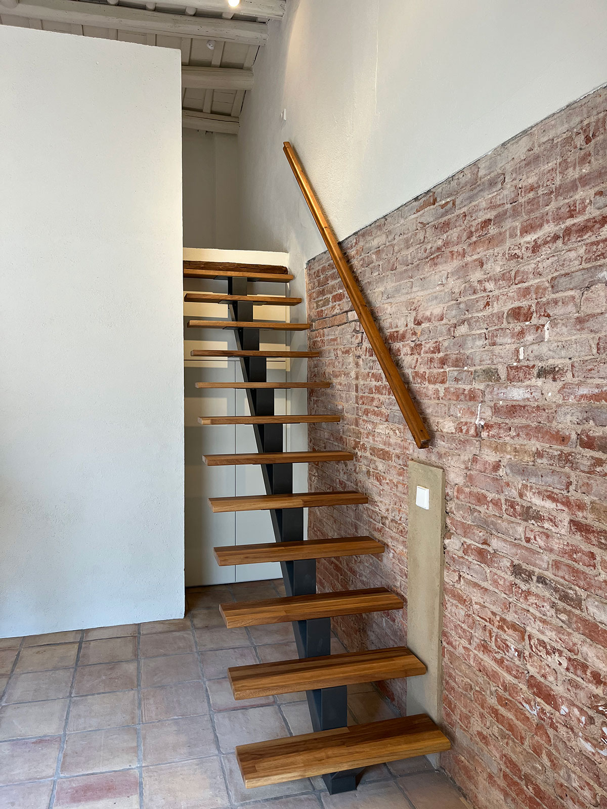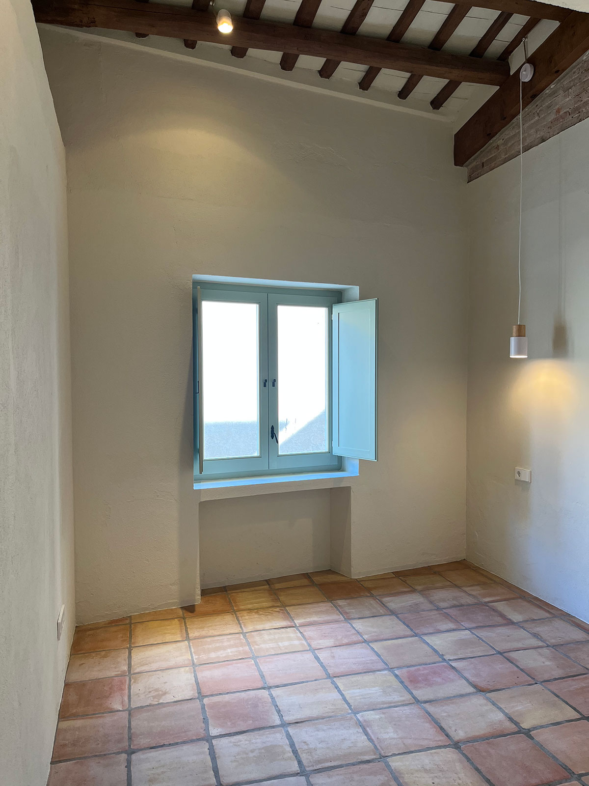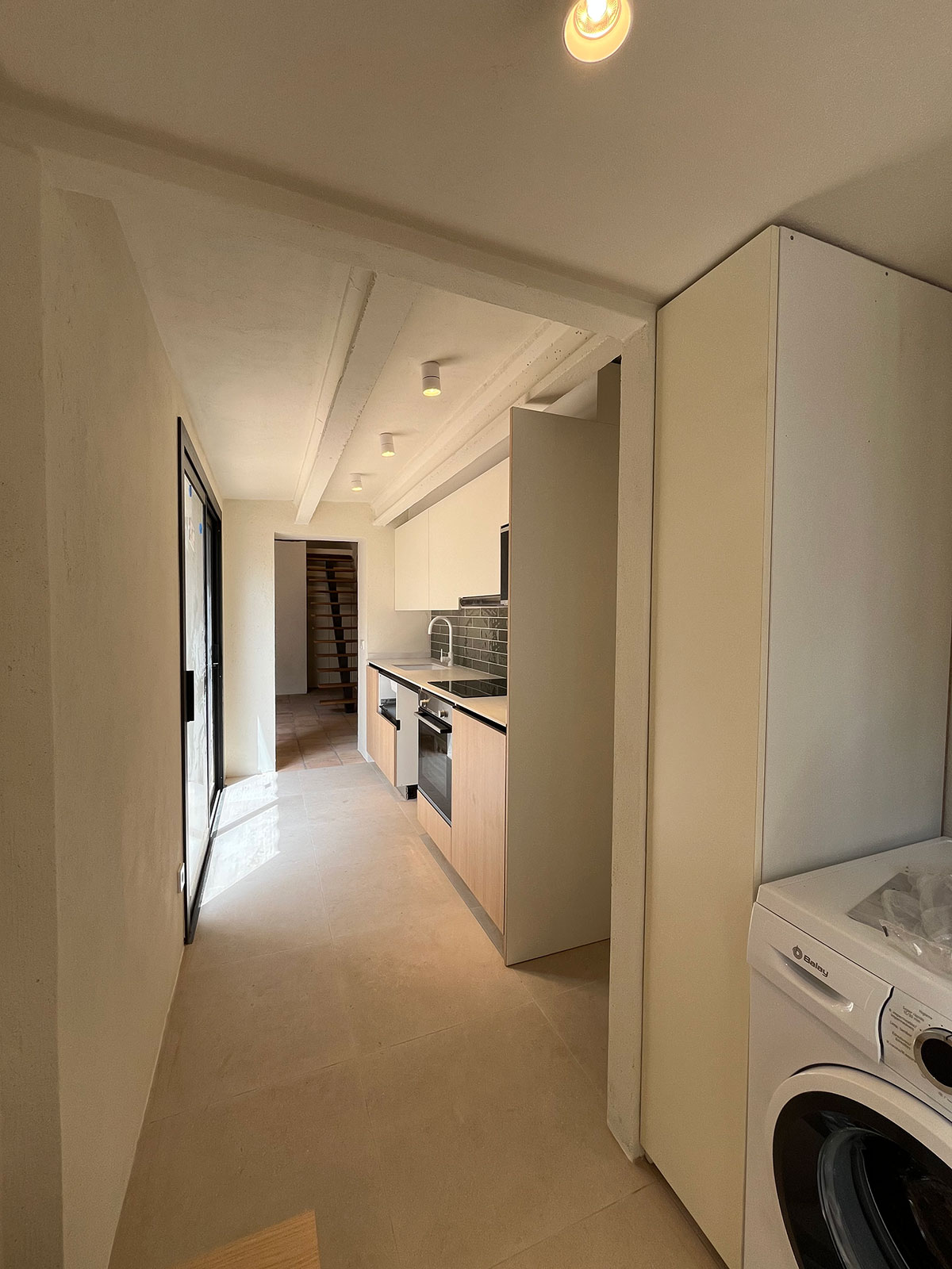 Des de la sala accedim amb una escala metàl·lica a la zona de l’altell i en un laterla de la sala a la cuina. També dona accés amb una gran balconera el pati amb orientació sur de la casa.
