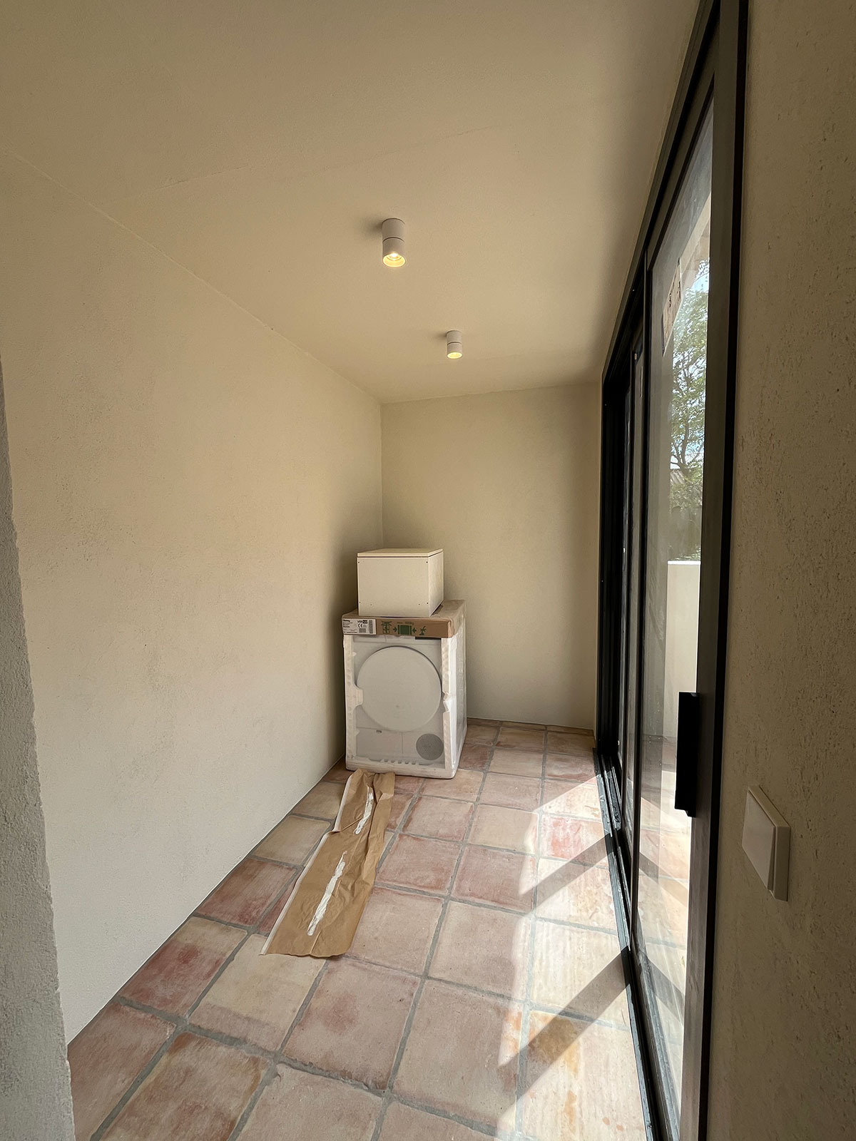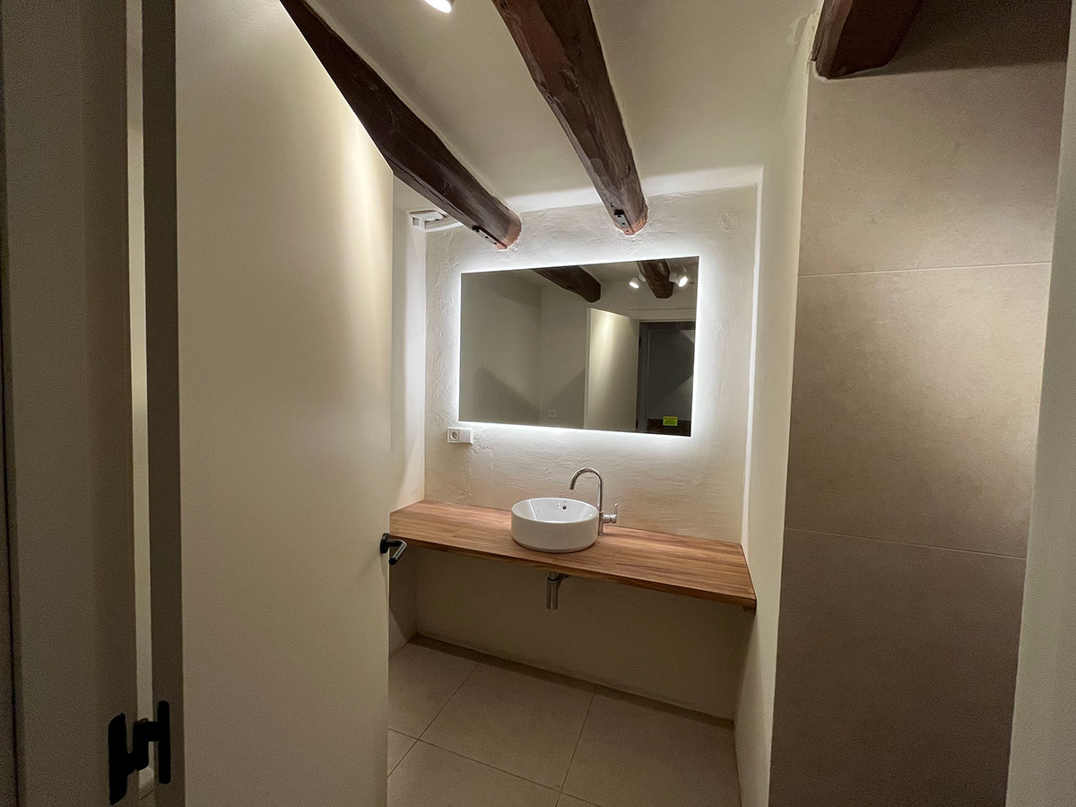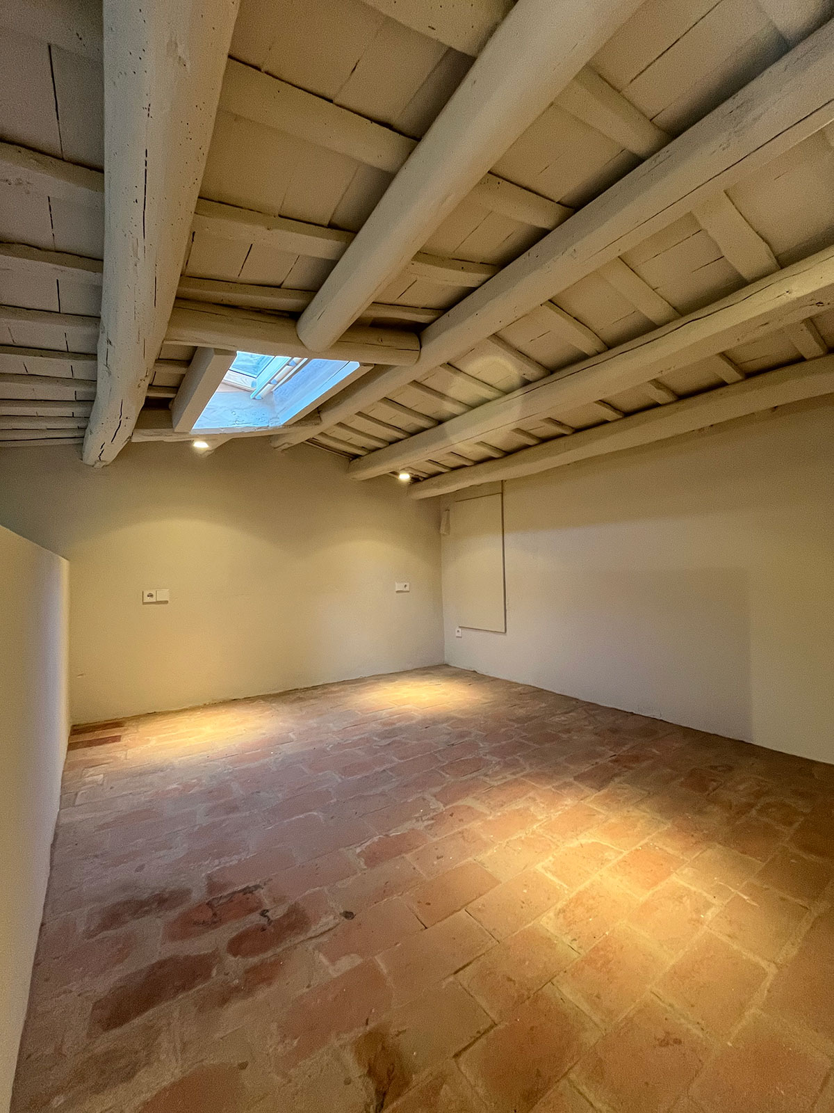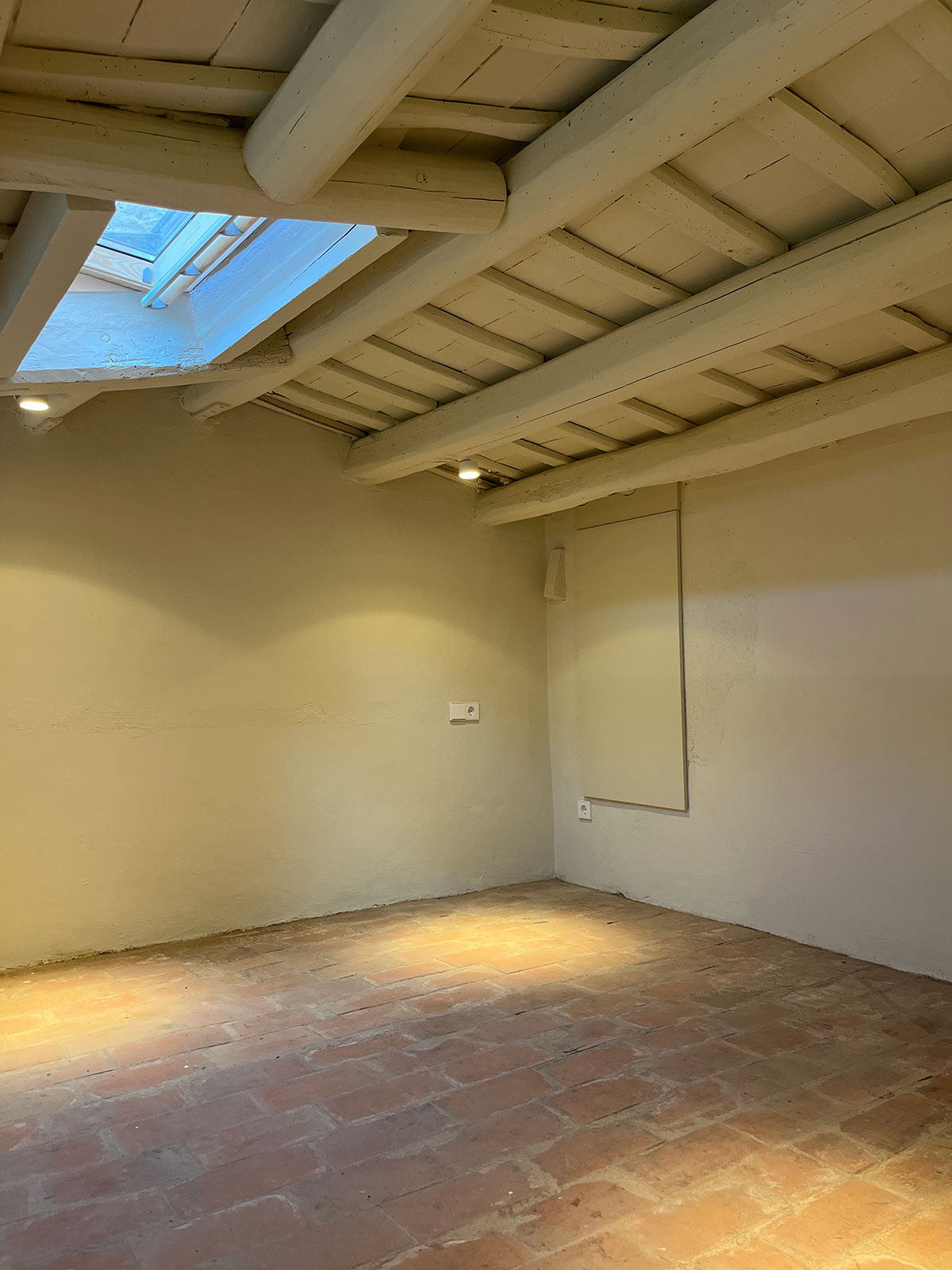 Des de la sala accedim amb una escala metàl·lica a la zona de l’altell i en un laterla de la sala a la cuina. També dona accés amb una gran balconera el pati amb orientació sur de la casa.