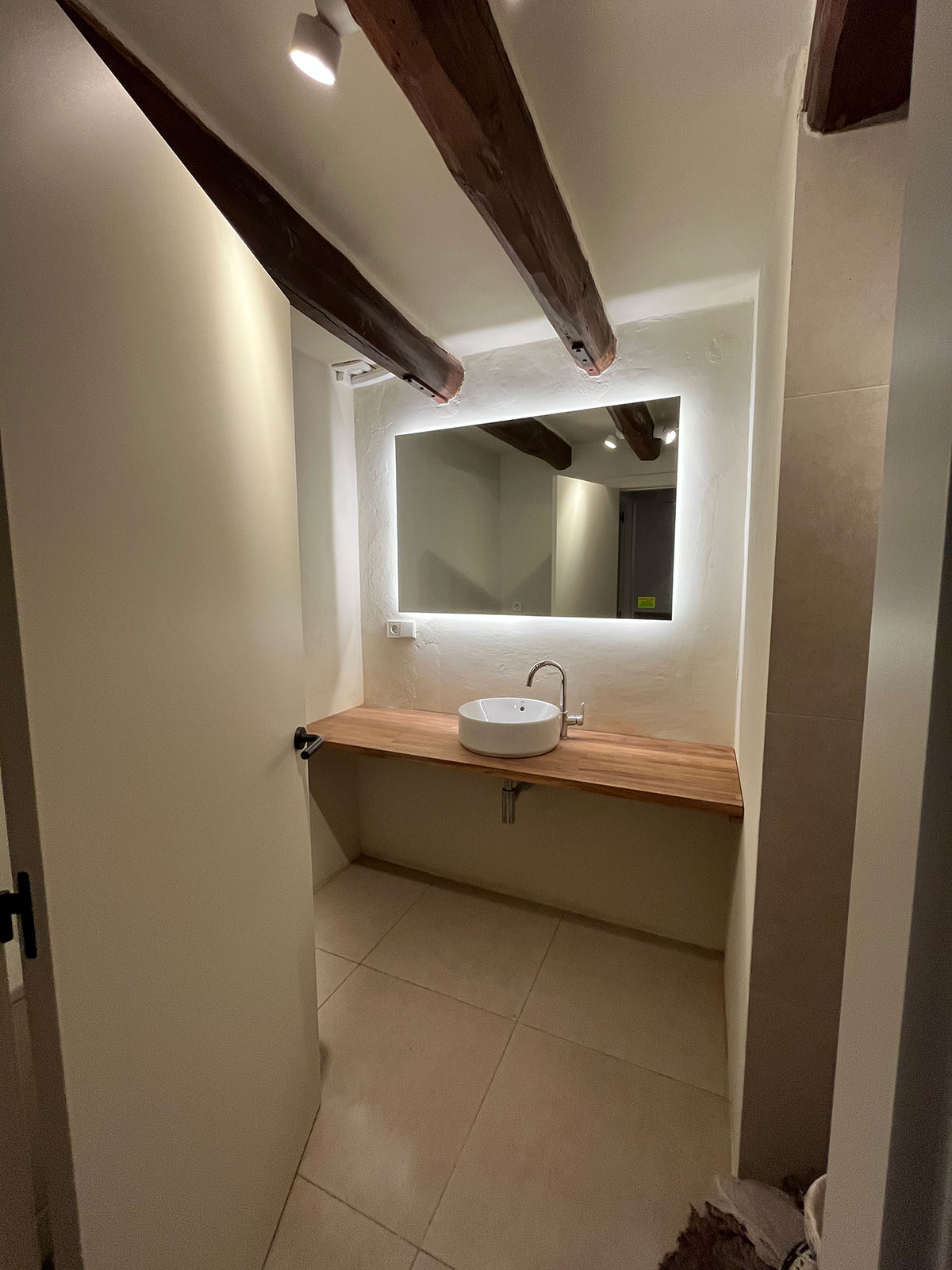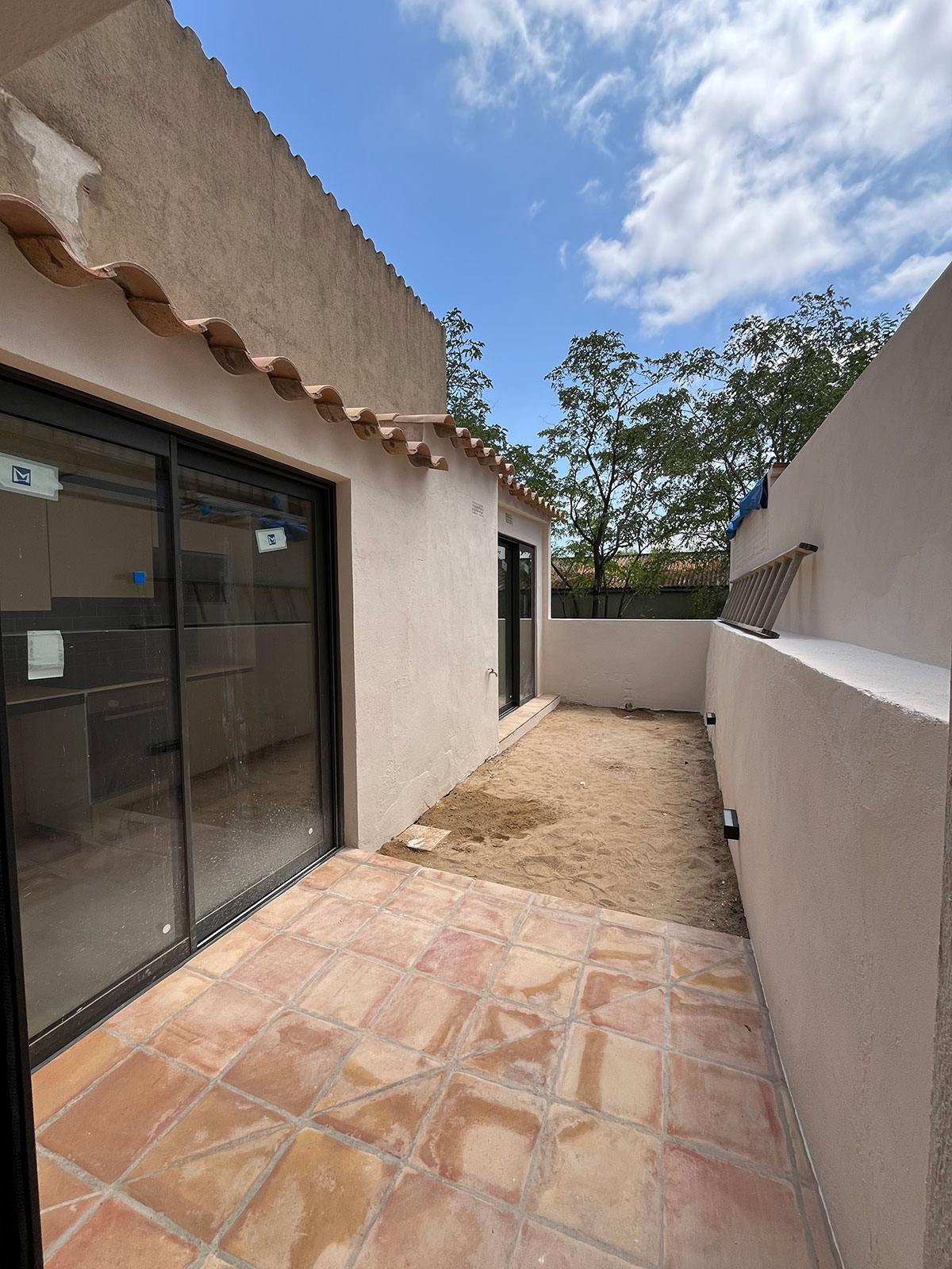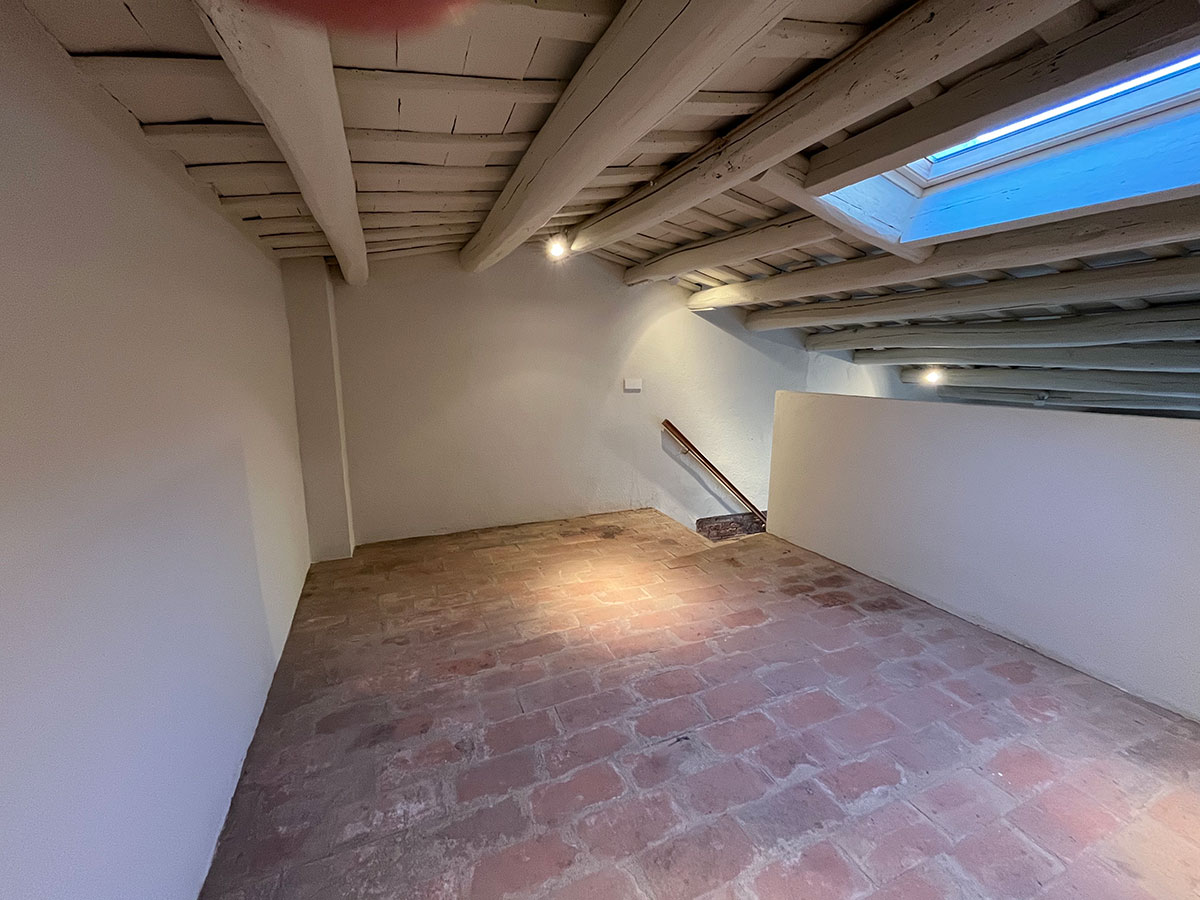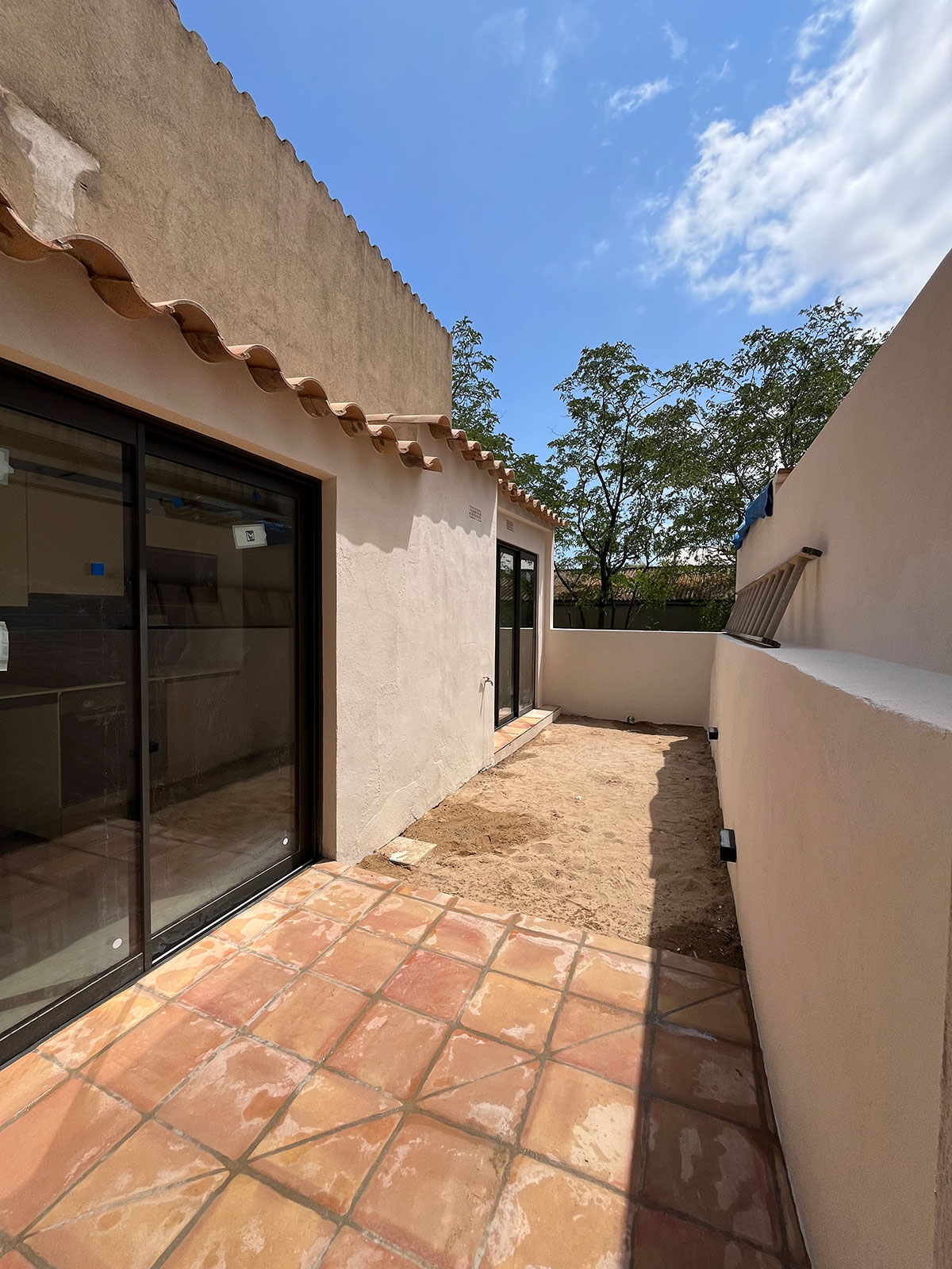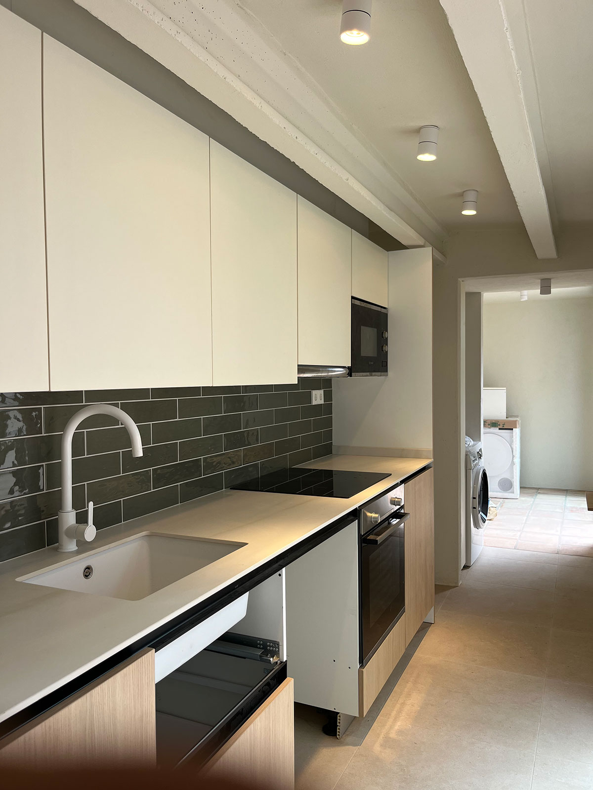 Des de la sala accedim amb una escala metàl·lica a la zona de l’altell i en un laterla de la sala a la cuina. També dona accés amb una gran balconera el pati amb orientació sur de la casa.